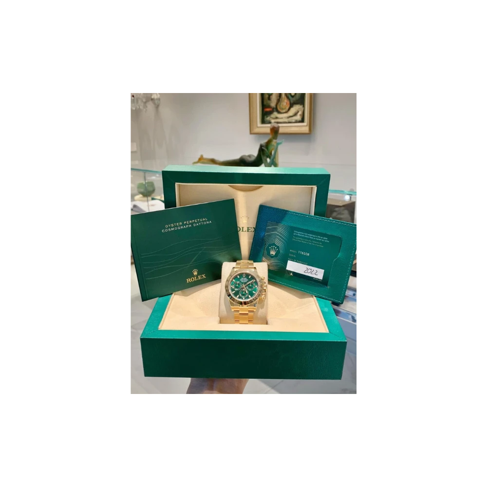 The Rolex Cosmograph Daytona Ref. 116508‑0013 masterfully combines performance and prestige. Its fully yellow-gold construction radiates luxury, while the vibrant green dial introduces an unexpected, modern twist to the classic Daytona aesthetic. The contrasting tones, subtle red highlights, and Chromalight lume enhance both functionality and appeal. Housing the advanced Calibre 4130, this Daytona offers cutting-edge chronograph precision, a 72-hour reserve, and everyday resilience. Endorsed by collectors, musicians, and athletes alike, it’s far more than a chronograph—it’s a statement of bold individuality, mechanical excellence, and collectible value.