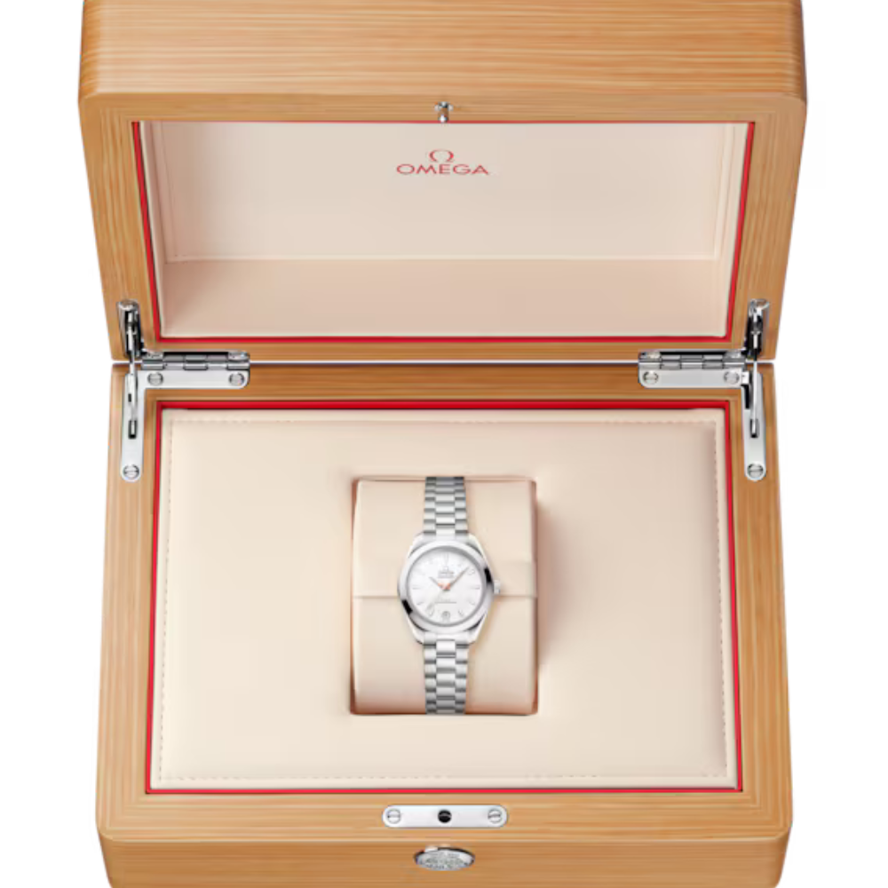 The Omega Seamaster Aqua Terra Ref. 220.10.30.20.02.001 distills the line’s sport-elegance into a refined 30 mm package. A silvery sun-brushed dial with horizontal teak pattern pairs with a stainless-steel bracelet, delivering daily versatility with Master Chronometer performance.